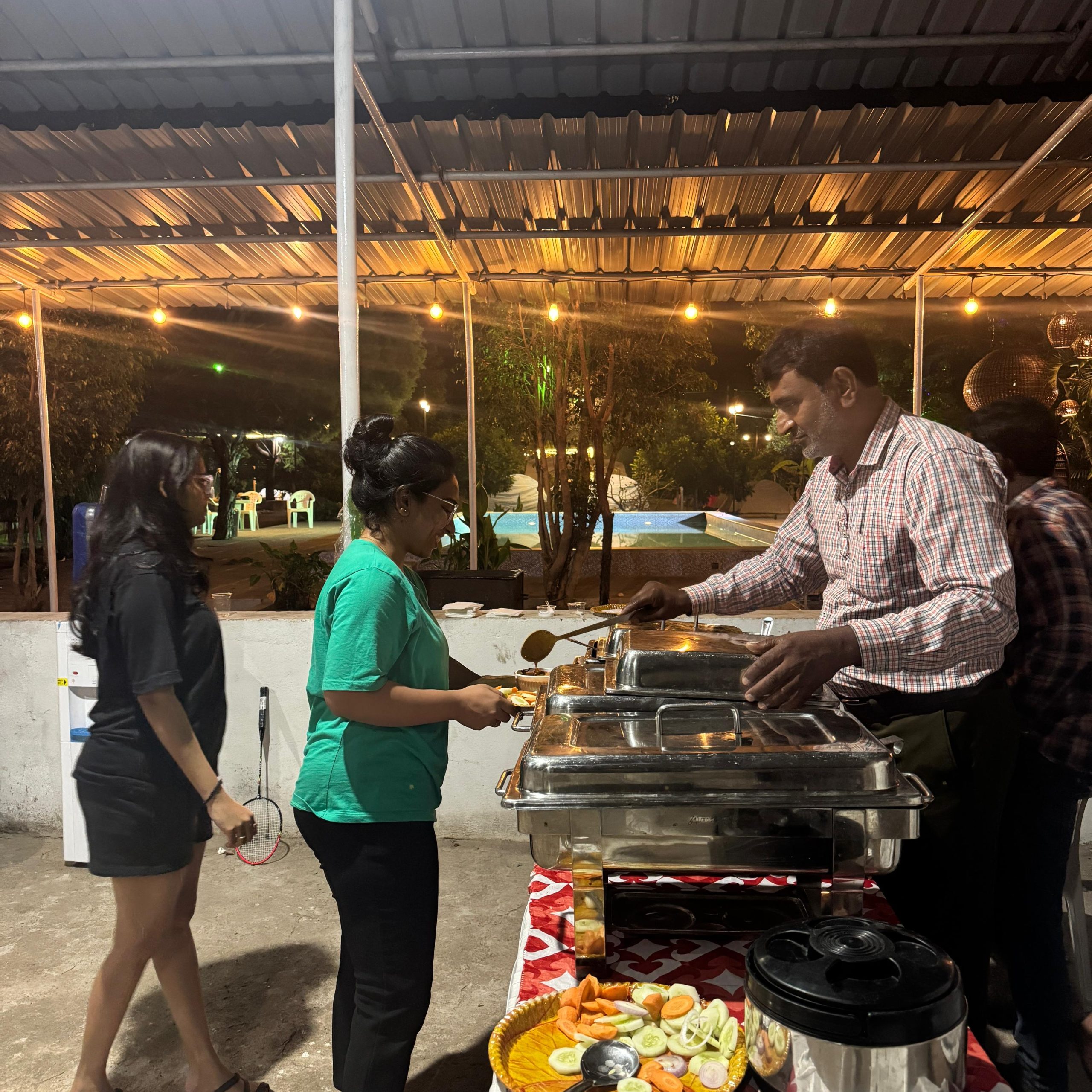 High Tea :- Tea - Pakoda Dinner:- Salad, Bagara Rice - Chicken curry, Bagara baingan (Gutti vankaya) Roti - raita - one sweet Breakfast :- poori & curry - Upma - Tea